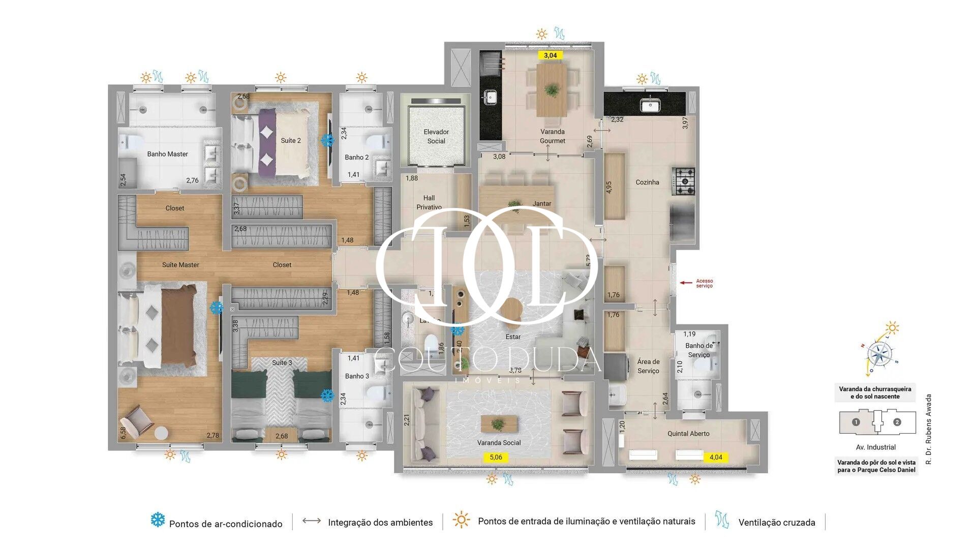 165m², com depósito privativo na garagem, 3 suítes, lavabo e um diferencial exclusivo: sala com duas varandas, o que possibilitará a ventilação cruzada, sendo uma social e outra gourmet com churrasqueira carvão. Ideal para receber amigos e familiares. Os apartamentos contarão com 11 pontos de entrada de luz, além de quintal aberto, um espaço reservado para colocar as condensadoras de ar-condicionado e o aquecedor de água.