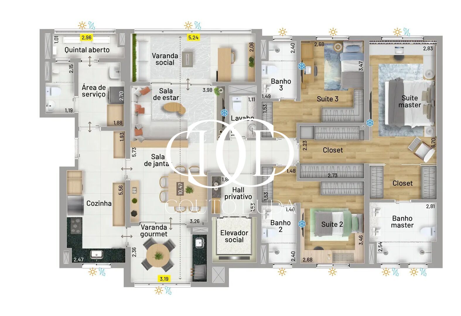 A sala terá ventilação cruzada e duas varandas. São mais de 10 metros entre uma varanda e outra. Além disso, são mais de 11 metros de vista aberta, somando a varanda social, a gourmet e o quintal aberto.
