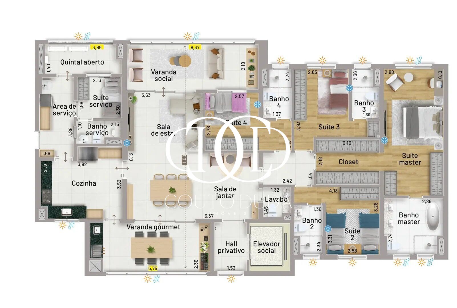 A sala terá ventilação cruzada e duas varandas. São mais de 10 metros entre uma varanda e outra. Além disso, são mais de 11 metros de vista aberta, somando a varanda social, a gourmet e o quintal aberto.
