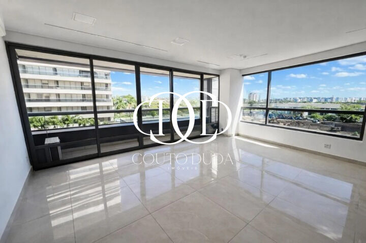 Destaque para a excelente iluminação natural proporcionada pelas amplas esquadrias de vidro e varanda externa, além de ar-condicionado já instalado.